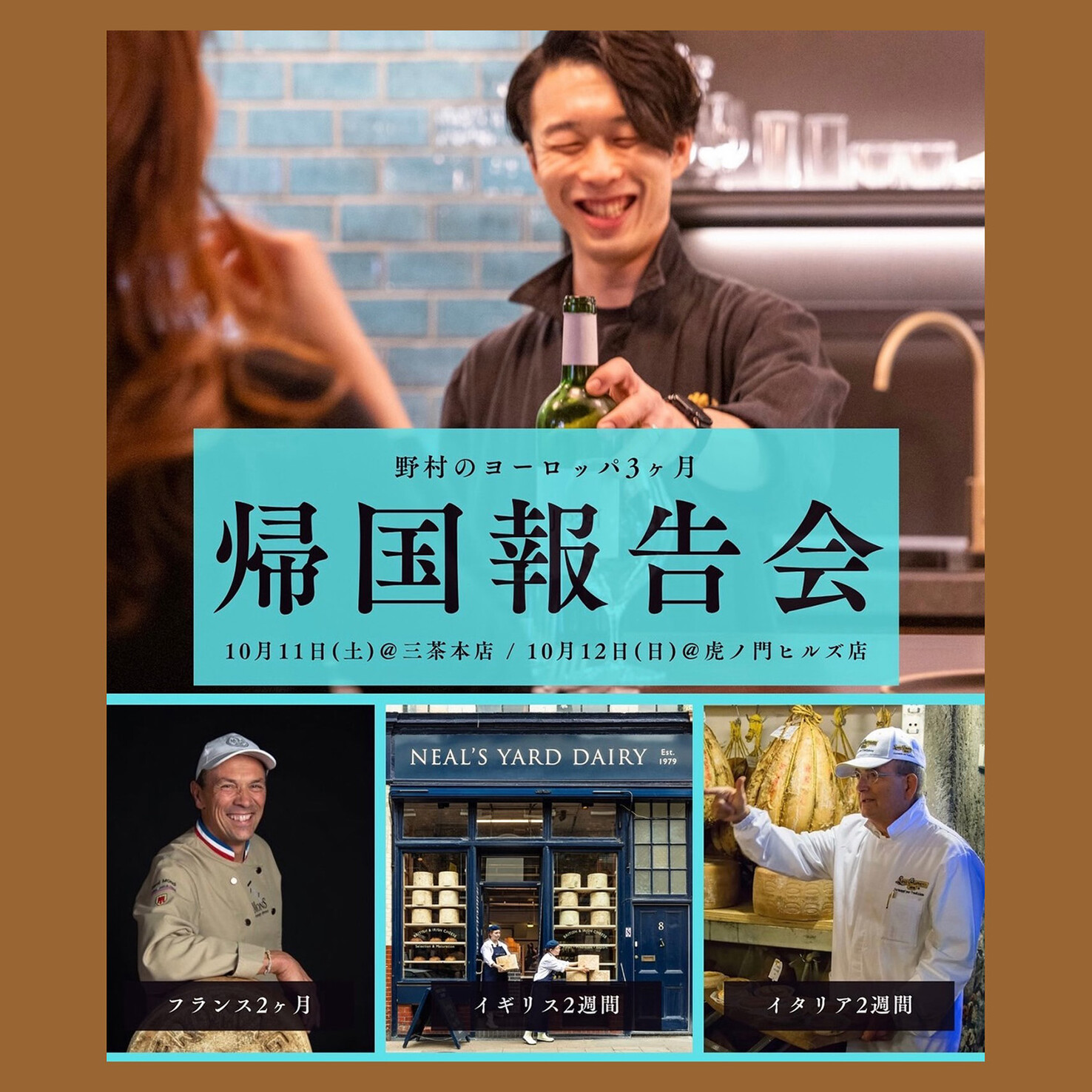 - I'm Nomura, the manager of Toranomon Hills store! Starting June 23rd, I'll be spending three months in Europe (France, the UK, and Italy), training under a cheese ager and visiting various wine and cheese producers! I wanted to share with you all what I saw and experienced there, so I organized this event! I'll be absorbing a lot and returning more mature, so please look forward to it!